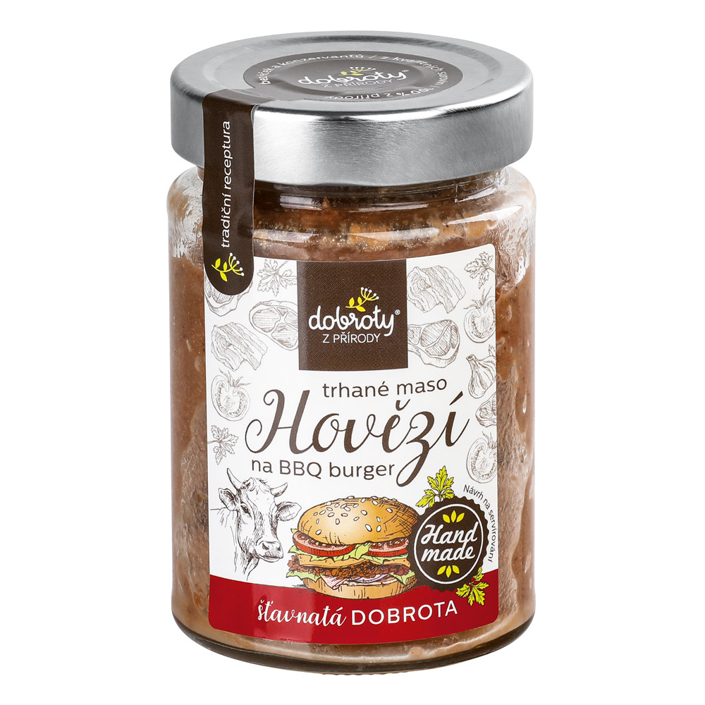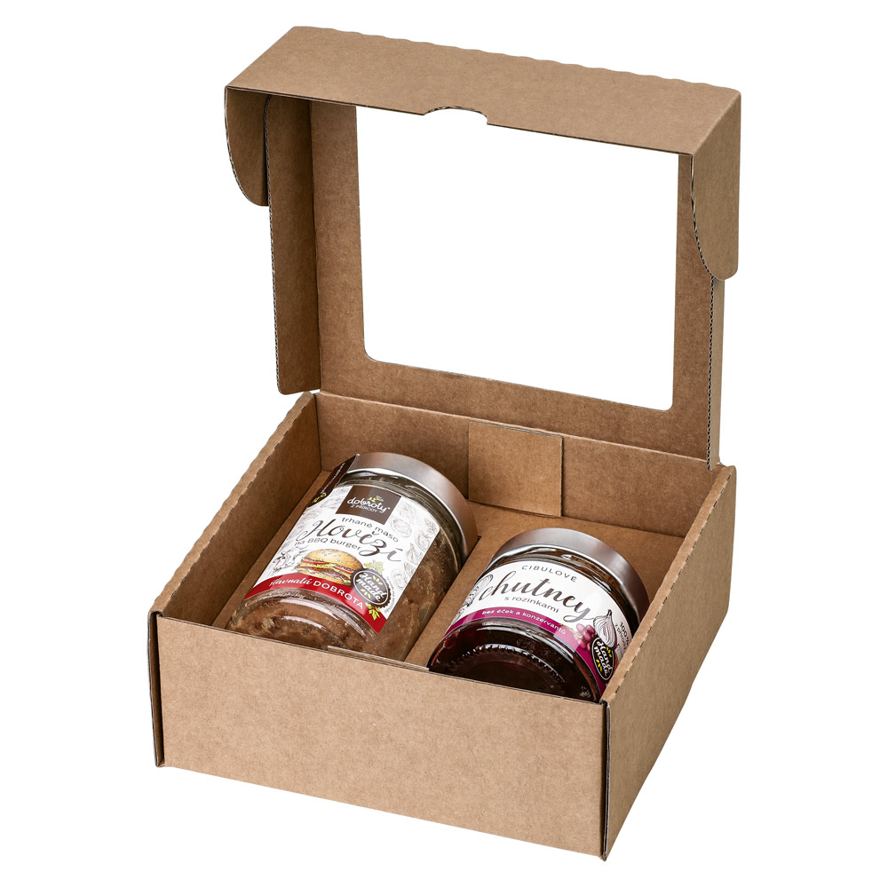 Darčekové balenie, šťavnaté BBQ hovädzie trhané mäso (250 g) a cibuľové chutney (180 g). 185 × 170 × 75 mm