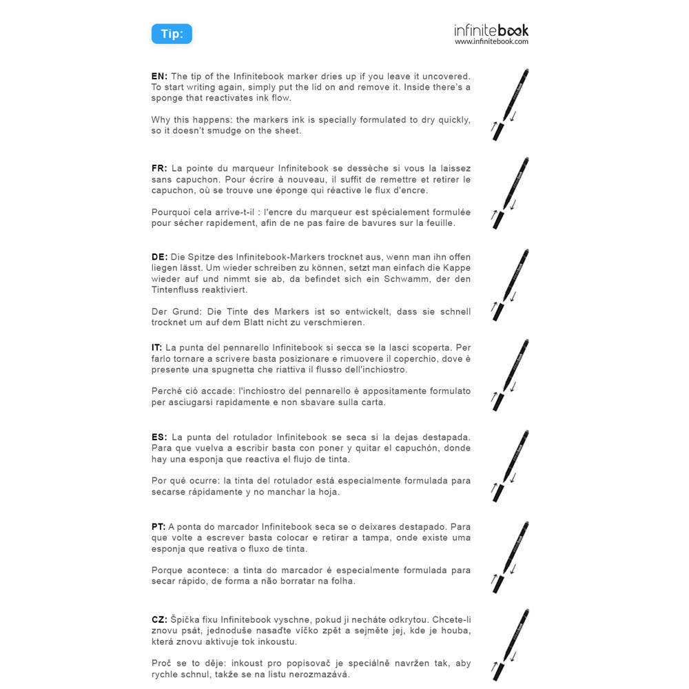 Zápisník A5 - "Infinitebook" - s flexibilným obalom a zodpovedajúcimi farebnými krúžkami. Obsahuje 15 obyčajných strán v štýle tabule a čierny fix. Tento poznámkový blok umožňuje jednoduché písanie a mazanie a je praktickým riešením na minimalizáciu spotreby papiera. Poznámky je možné skenovať. Vyrobené v Európe. Dodávané v kraft papierovej obálke s nálepkou. 148 x 210 mm