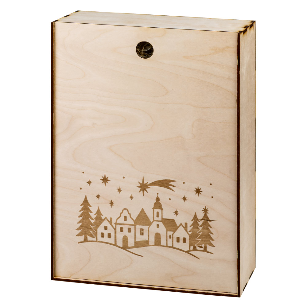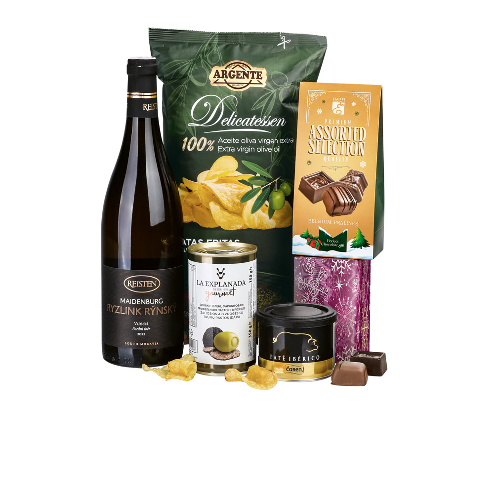 Darčeková súprava v drevenej krabičke s vrchnákom s laserom vygravírovaným zimným motívom. Obsahuje suché biele víno s prívlastkom neskorý zber Rizling Reisten (750 ml), bravčovú paštétu Ibérico (200 g), olivy s hľuzovkovou pastou (350 g), hranolky v extra panenskom olivovom oleji (160 g) a výber praliniek z mliečnej čokolády (48 g). 268 × 378 × 120 mm