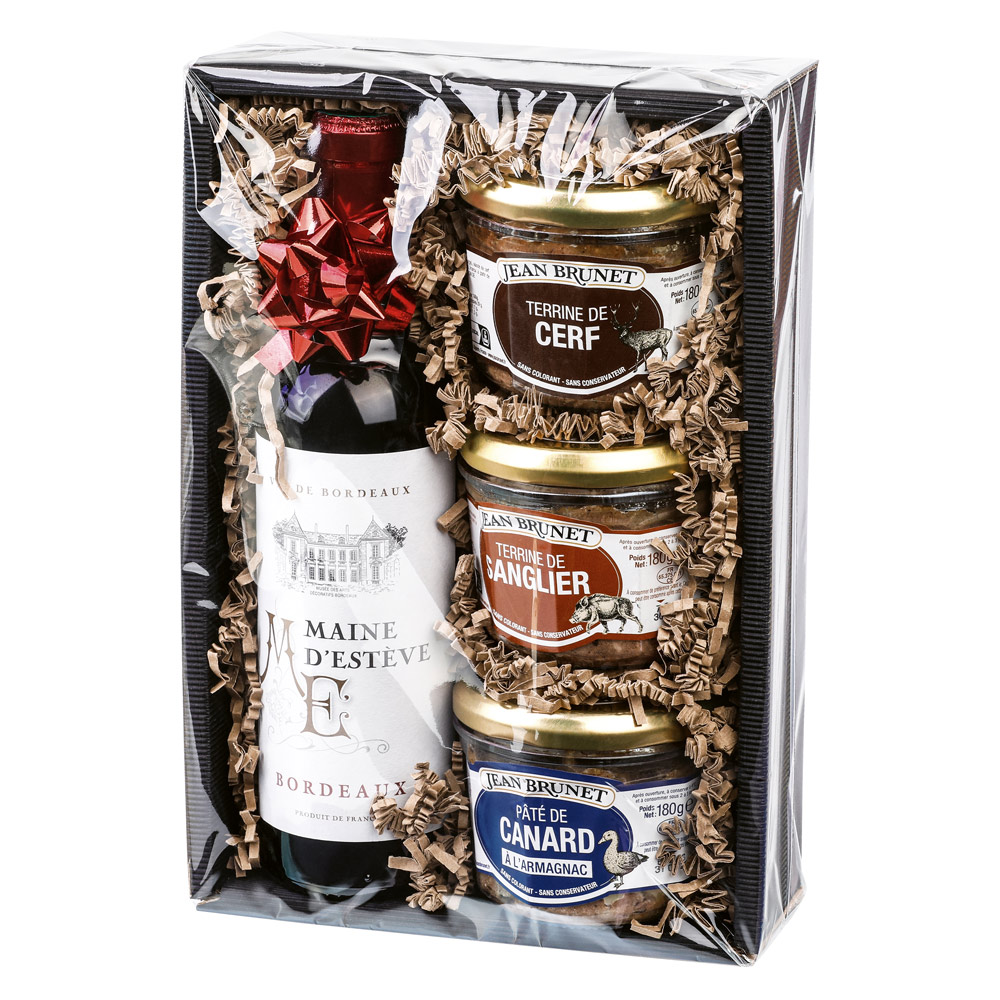 Darčeková sada v krabičke. Obsahuje kačaciu paštétu Jean Brunet s armaniakom (180 g), paštétu z jeleňa Jean Brunet (180 g), paštétu z diviaka Jean Brunet (180 g) a červené víno Maine d'Esteve - francúzske červené víno AOP Bordeaux (375 ml). 175 × 260 × 68 mm