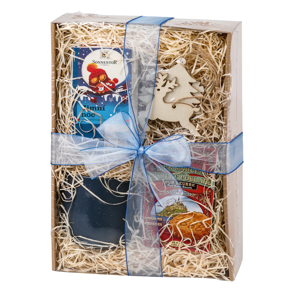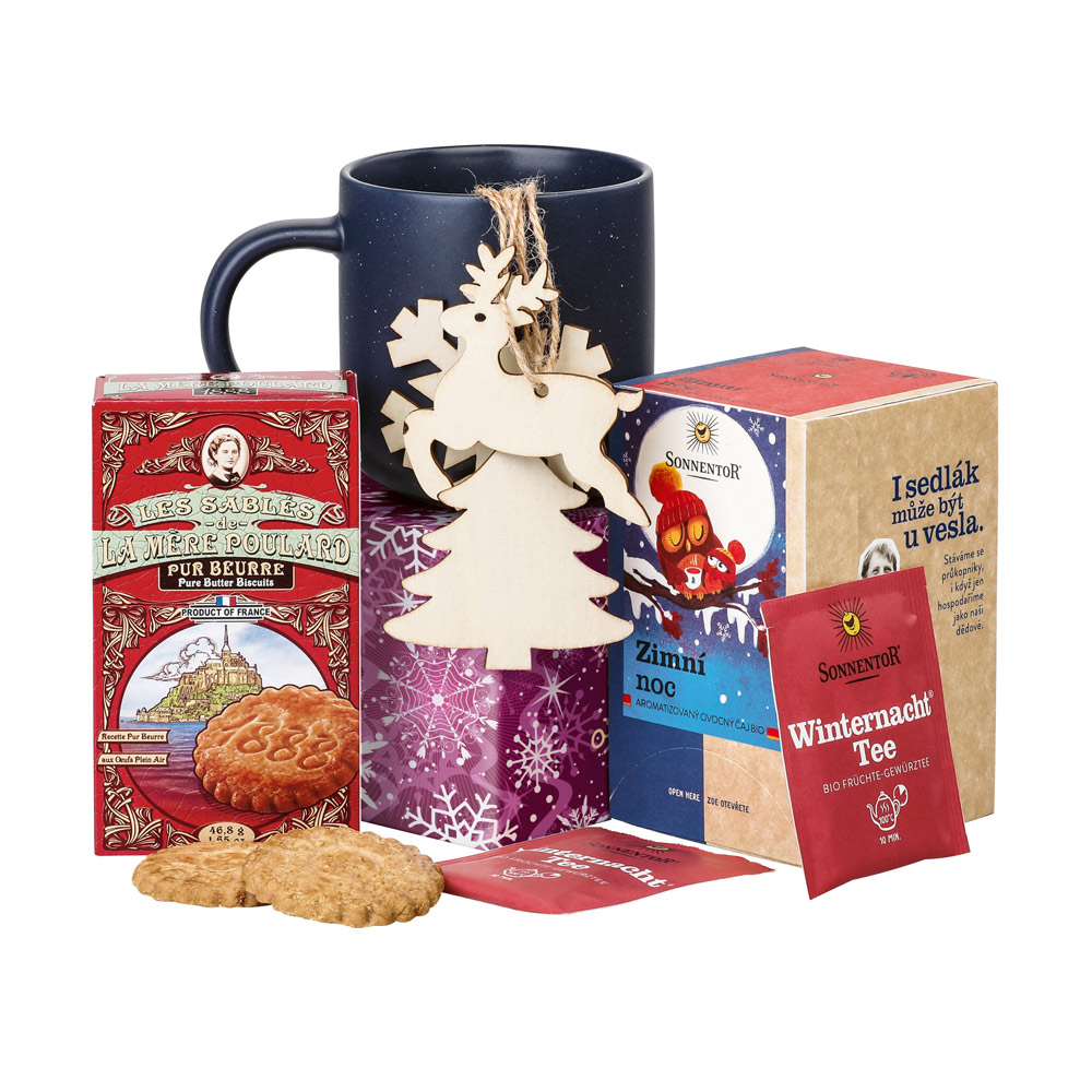 Darčeková sada v krabičke zviazanej modrou stuhou. Obsahuje tmavomodrý keramický hrnček s matným povrchom (370 ml), čaj Sonnentor Zimní Noc (18 vrecúšok), francúzske maslové sušienky La Mére Poulard (46,8 g) a 3 drevené ozdoby (cca 80 × 80 × 2 mm). 200 × 293 × 80 mm