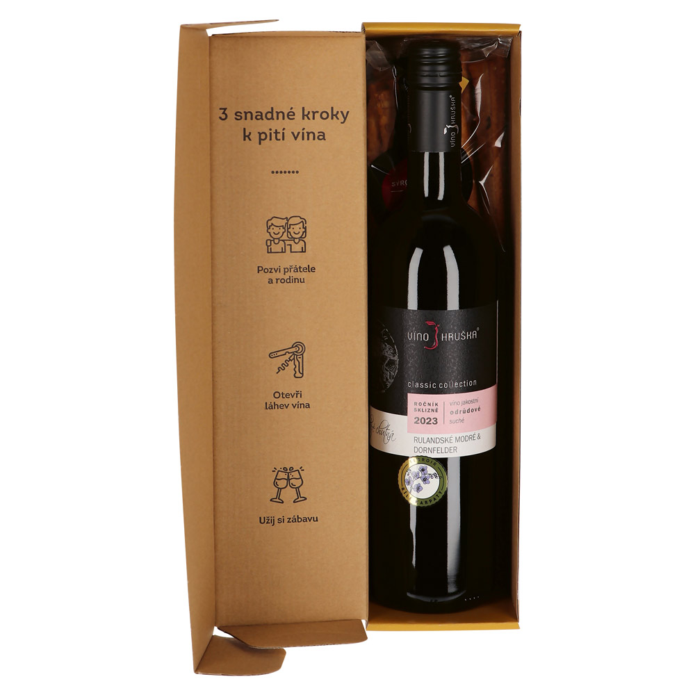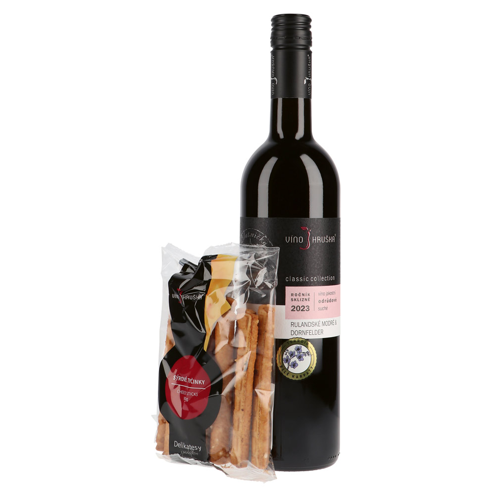 Pinot Noir & Dornfelder (750 ml l) a syrové tyčinky (90 g) v darčekovej krabičke. 336 × 86 × 84 mm
