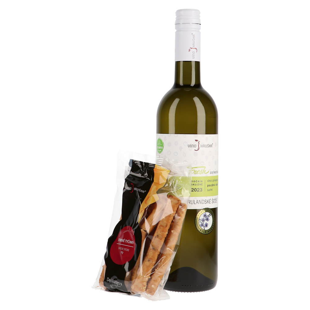 Rulandské šedé (750 ml) a syrové tyčinky (90 g) v darčekovej krabičke. 336 × 86 × 84 mm